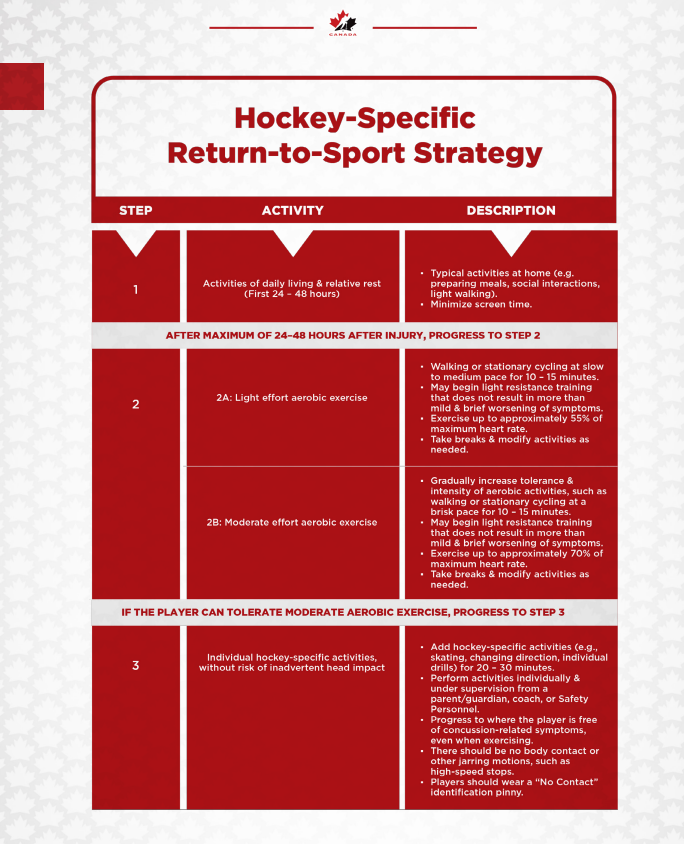 No member of the hockey community in Alberta - including coaches, safety personnel, and parents/guardians - is to pressure any participant to return to play until they have completed the 6 step Hockey-Specific return to play strategy and is medically cleared by a physician.