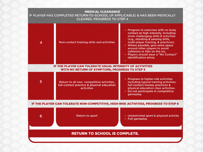Participants who have been provided with a Medical Clearance Letter or traditional medical documentation may progress through steps 4, 5 and 6 of the Hockey-Specific Return to Play Strategy to gradually return to full, unrestricted hockey-related activities.