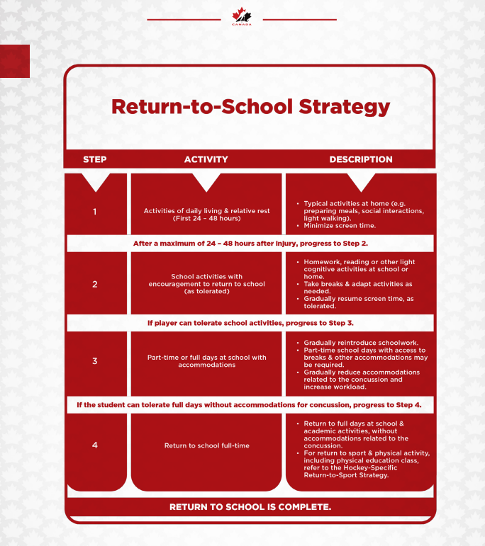 The stepwise progressions for Return-to-School and Hockey-Specific Return-to-Sport Strategies are outlined in the Concussion Protocol, both these strategies begin at the same time, can happen concurrently and the first step of both is the same.