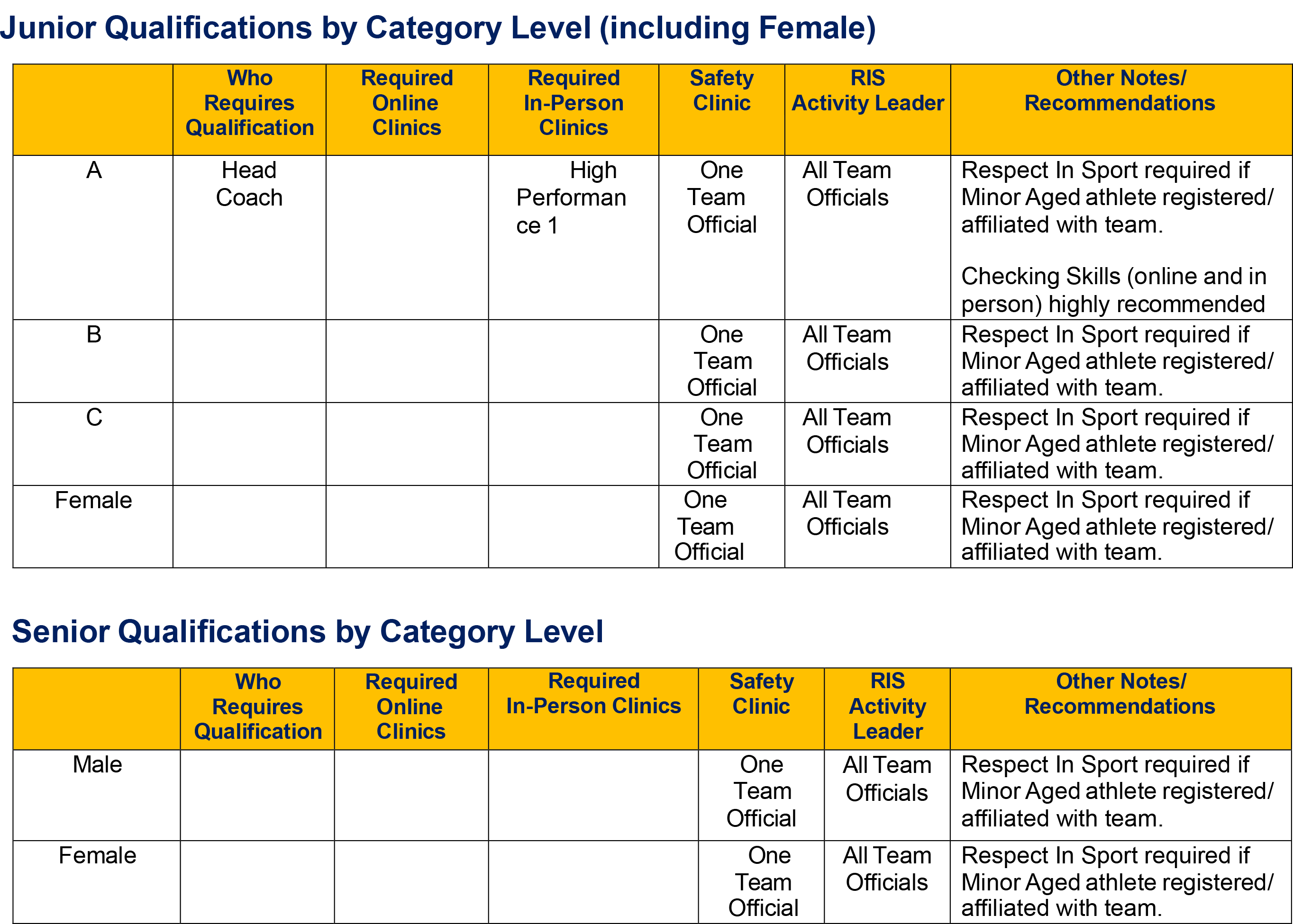 - The requirements for Junior B, Junior C and Junior Female are Respect in Sport (if a minor-aged athlete is registered and/or affiliated with the team) and One Team Official requires Hockey Canada Safety.