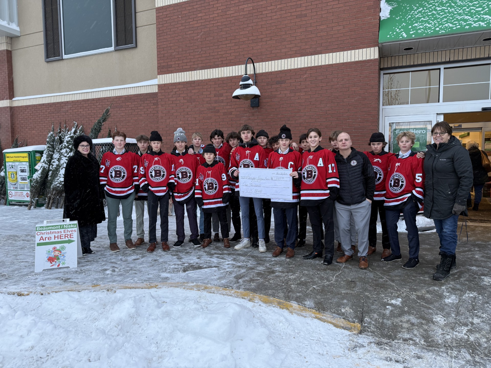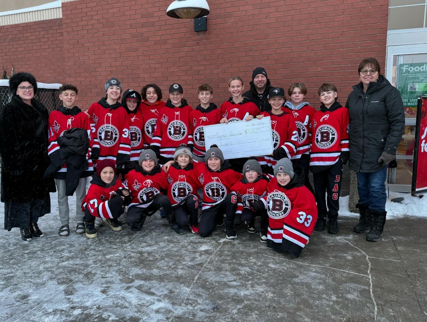 The Beaumont Athletic Club U13AA team was pleased to donate $500 from a recent fundraiser to the Beaumont-Nisku Christmas Elves. Thanks to a matching donation from the Government of Alberta, this contribution will be doubled, resulting in a total donation of $1,000. This generous support will help families in need during the holiday season.