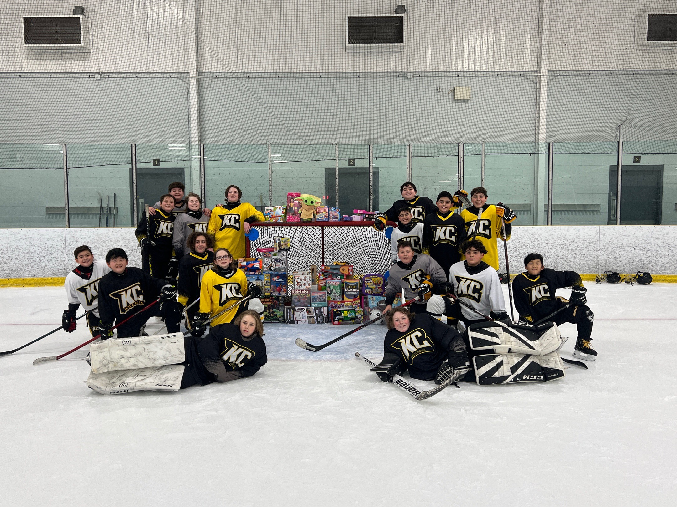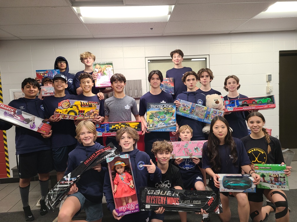 The KC Columbians U13AA team collected toys for Toy Mountain, supporting the Boys and Girls Club Big Brothers Big Sisters Edmonton and Area. Each player brought toys to practice, contributing to a growing mountain of donations.