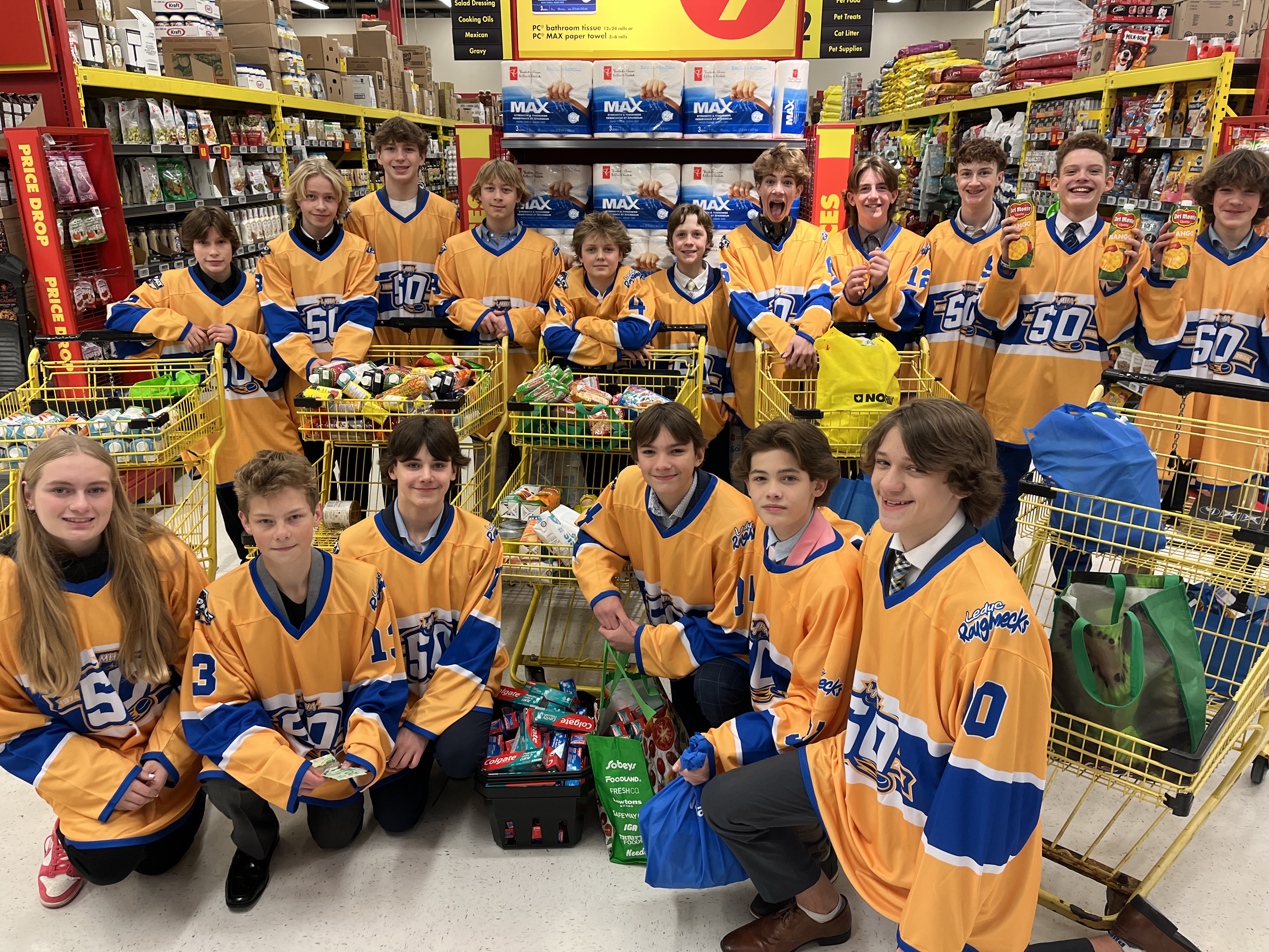 The Leduc U15AA Roughnecks arranged a day to visit the grocery store and picked up items for the Leduc & District Food Bank. Later that evening, they partnered with the St. Albert Saints during a league game, bringing in even more donations.