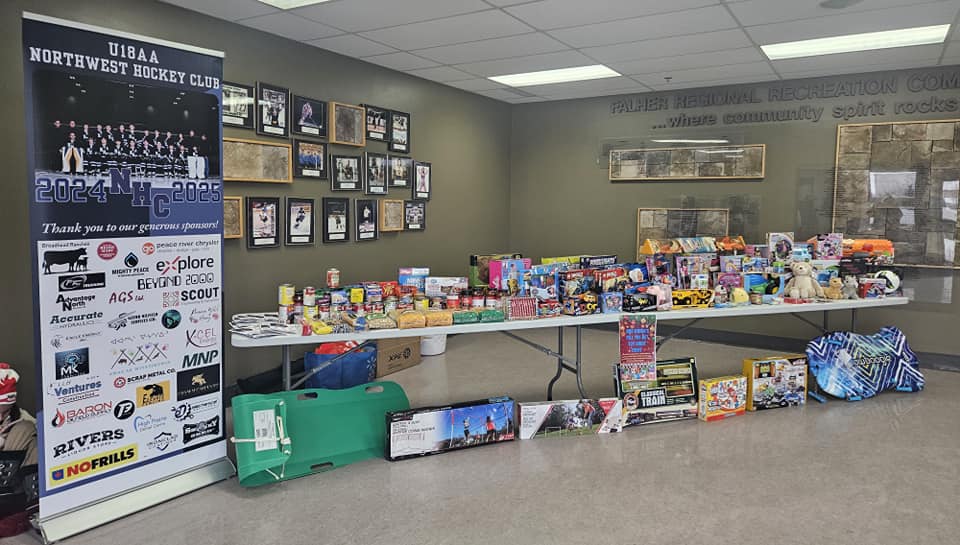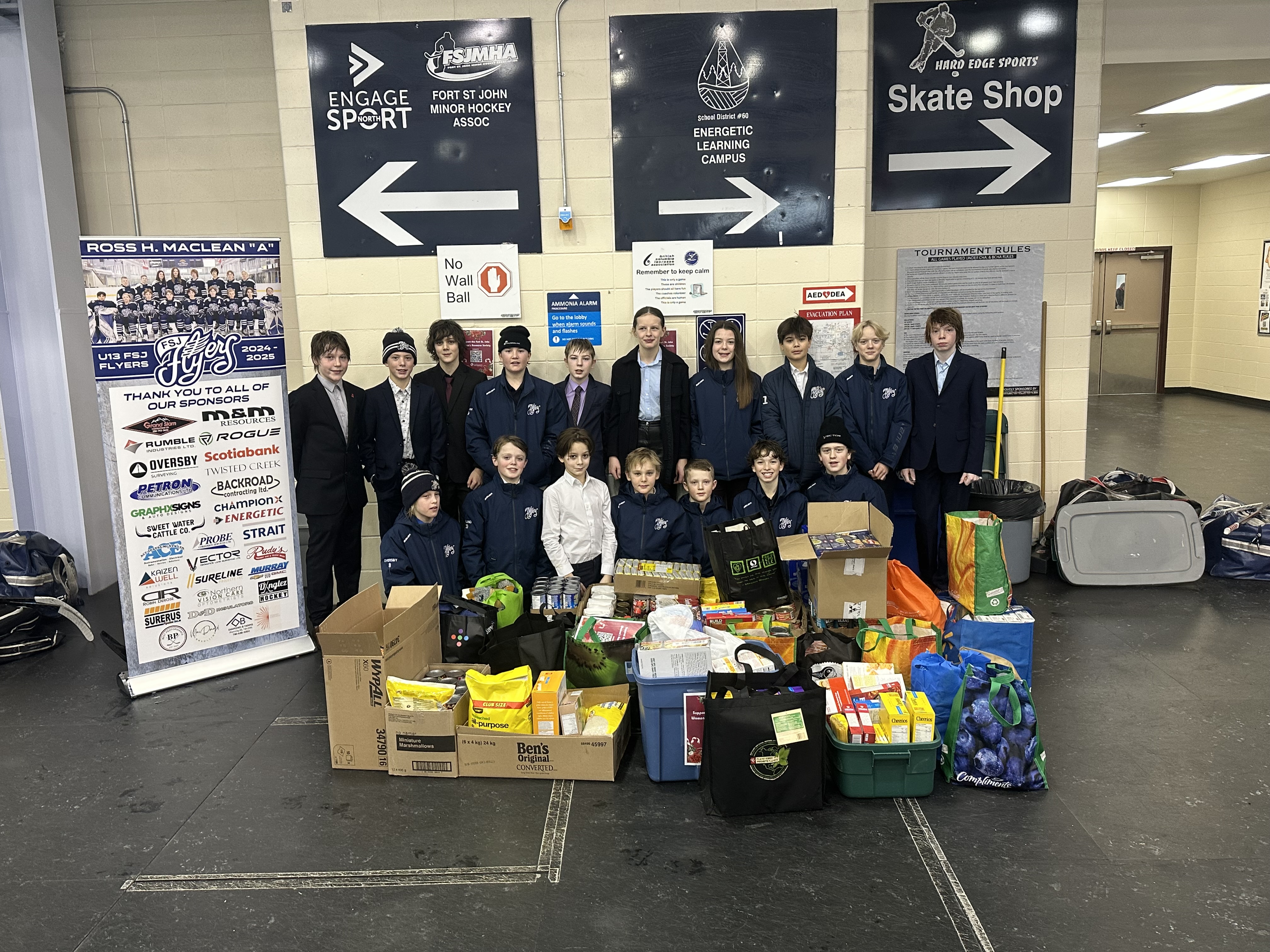 The Fort St. John ‘A’ Flyers U13AA recently held a successful food drive during their home games against the Strathcona Warriors on December 7th and 8th. The team’s efforts helped support the Fort St. John Women’s Resource Centre, with the Flyers collecting a truck box full of food and multiple bags of warm winter gear.