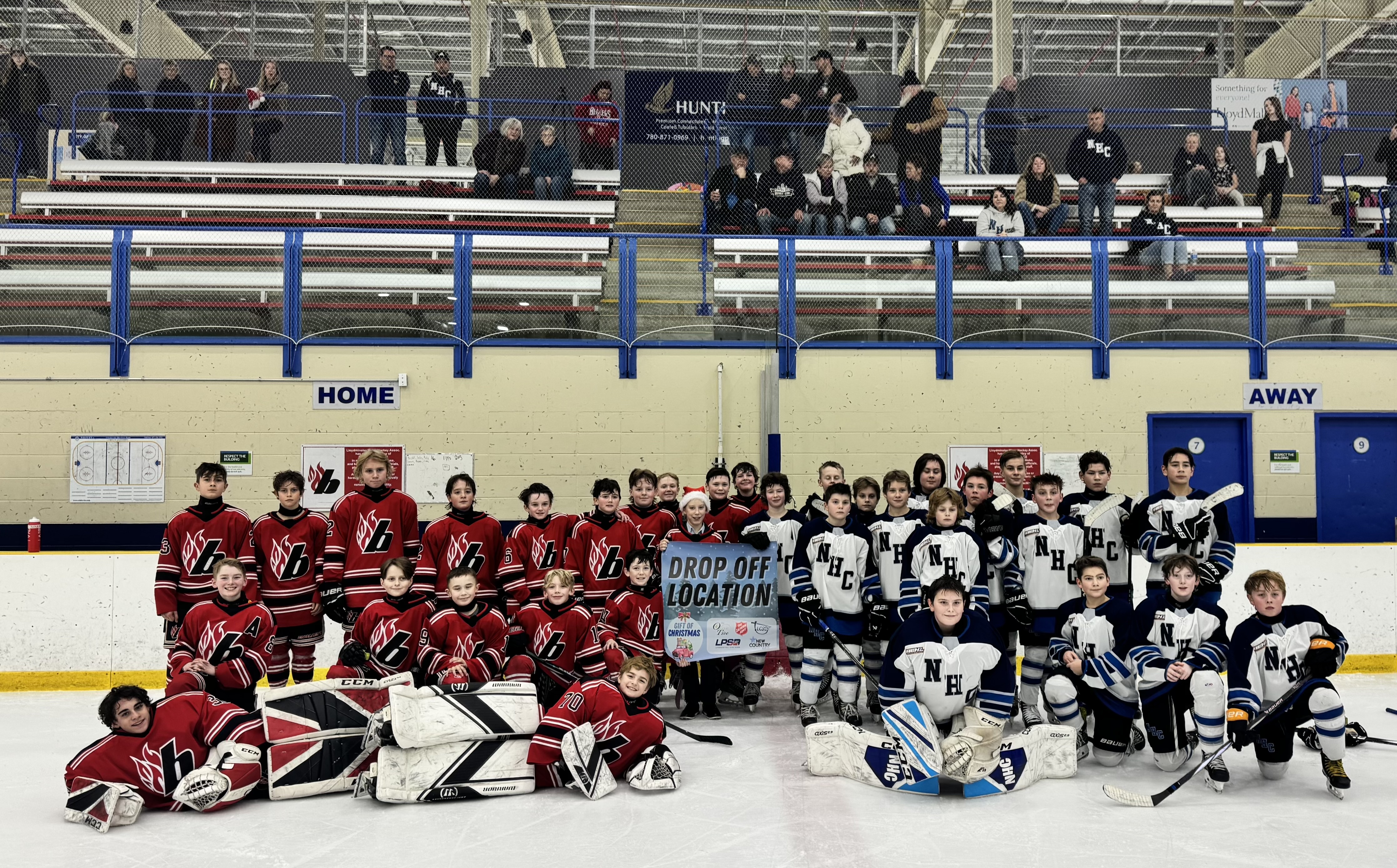 The MLAC U13AA hockey team hosted a special Santas Anonymous Game to raise donations for children and families in the Edmonton community. They advertised and requested donations for Santas Anonymous, setting up a special table at the game to collect cash and toy donations. Many of the players reached out to businesses and community members to gather contributions. The team played against the Beaumont AC U13AA team, who also participated by bringing donations for Santas Anonymous.