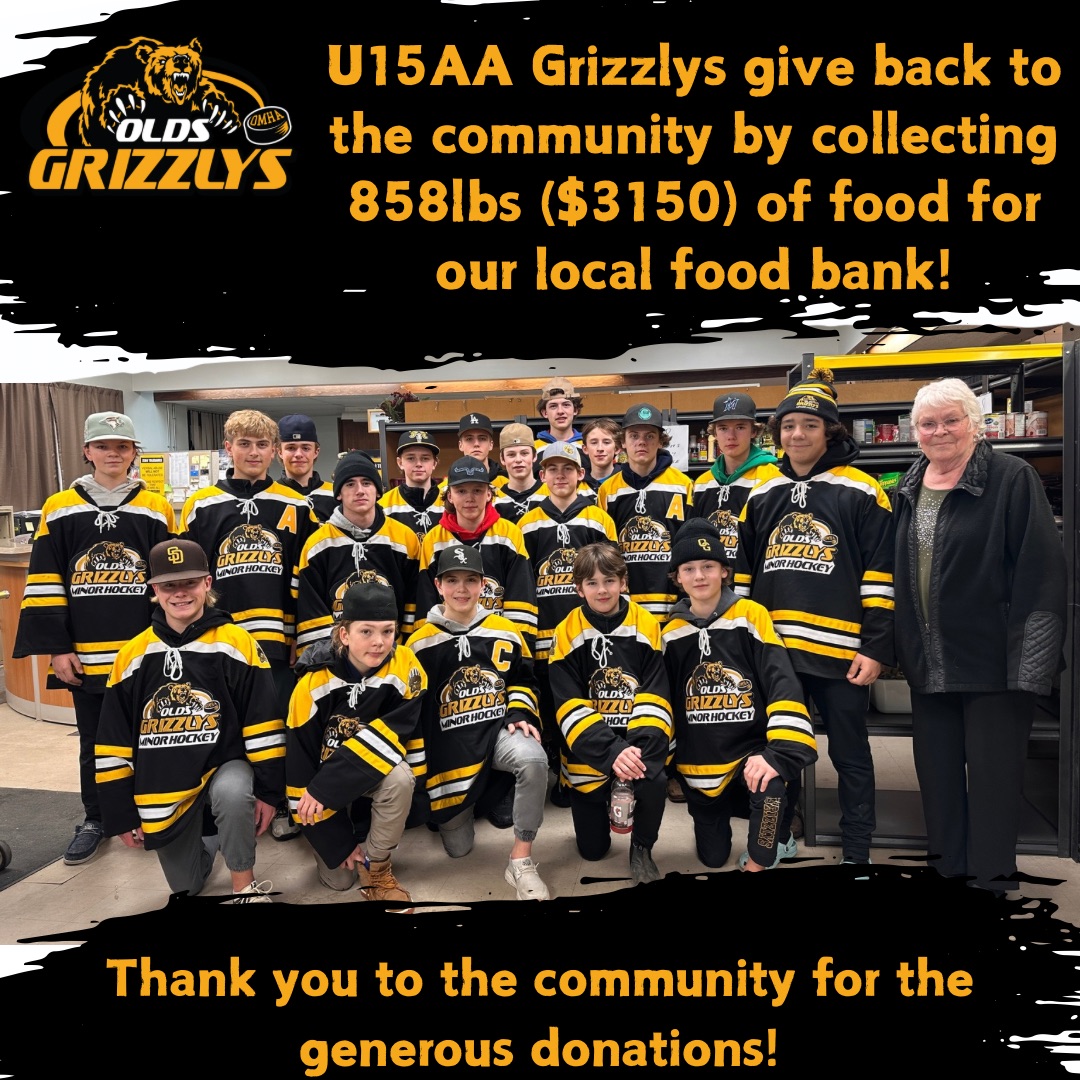 The Olds Grizzlys U15AA team set out to “fill the hockey bag to fill the food bank” this holiday season as a way to give back to the community that supports their minor hockey association. The team collected approximately 850lbs of food, valued at around $3,000. The Olds Grizzlies U15AA team wishes everyone a very Merry Christmas and a joyful holiday season.