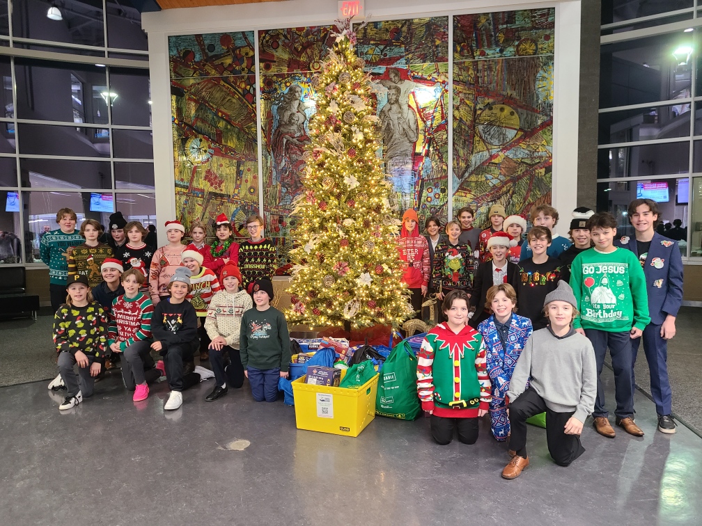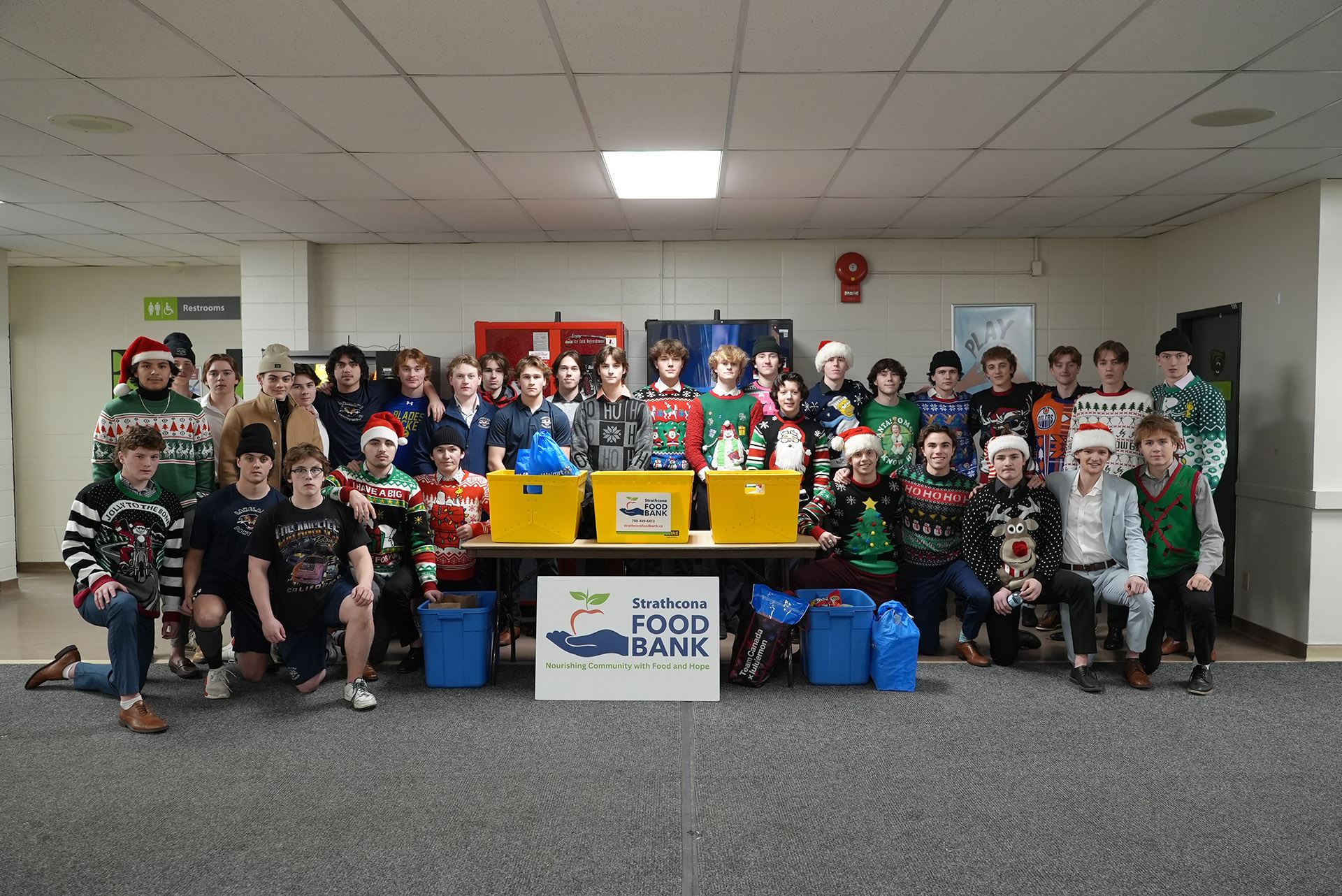 The Strathcona Warriors U13AA organized a drive for the Strathcona Food Bank on Friday, December 13, during a league game. They invited the U13AA Sturgeon ConTrac Sting, along with friends and family, to join in donating items for the Food Bank. Both teams wore Christmas sweaters and worked together to collect as many items as possible. In the end, they were able to deliver an entire truckload of food to support the Food Bank and families in need.