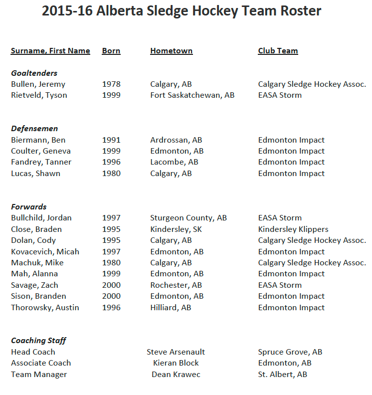 Alberta Sledge is proud to announce the 15 player roster for the Provincial Sledge Hockey Team that will represent Alberta for the 2015-16 season. The roster was finalized following a two-day selection camp in Wetaskiwin. The camp included a skills evaluation and two intrasquad games. Alberta’s roster includes two goaltenders, four defense and nine forwards. Head coach Steve Arsenault (Spruce Grove) assembled the roster with support from associate coach Kieran Block (Edmonton), and team manager Dean Krawec (St. Albert).
